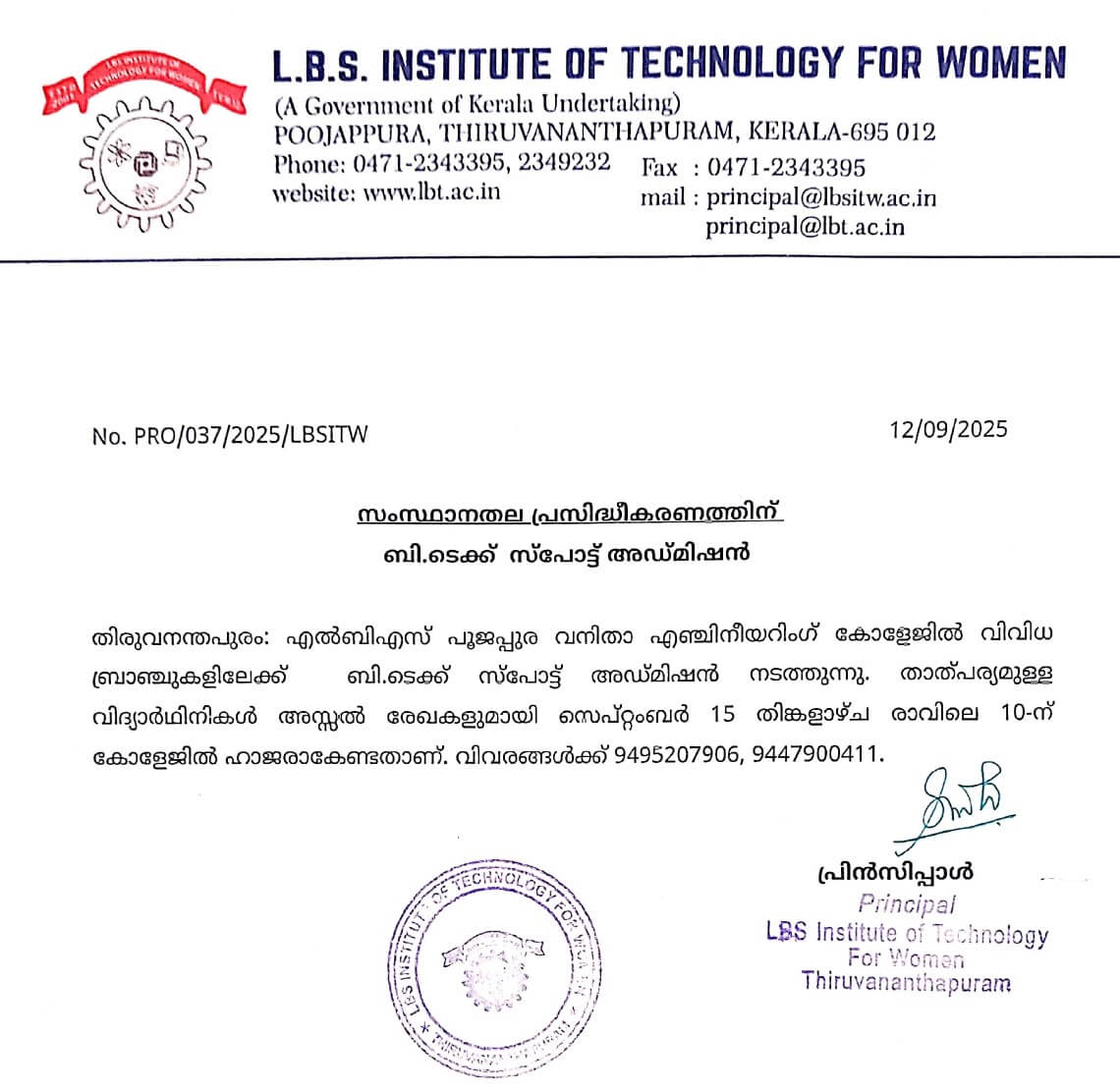 B.Tech Spot Admission to various engineering programs will be held on 15/09/2025 at 10 AM. Existing vacancies in all branches and all quotas will be considered in this spot admission.