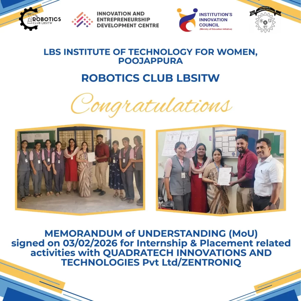 LBS INSTITUTE OF TECHNOLOGY FOR WOMEN signed a Memorandum of Understanding (MoU) with QUADRATECH INNOVATIONS AND TECHNOLOGIES Pvt Ltd / ZENTRONIQ ,a fast emerging start up company in the field of Robotics on 03/02/2026. This strategic partnership aims to bridge the gap between academia and industry by fostering innovation, collaborative research, joint research projects, publications, internships, project mentorship and industrial visits.